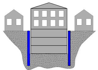 Существует множество технологий возведения фундаментов в стеснёных условиях. Один из вариантов называется "Опускной колодец" или "Кессон" . Когда жёсткое сооружение создаётся на поверхности земли и постепенным подкапыванием под него заглубляется в грунт до необходимой отметки. Данный метод очень дорог и относительно редко применяемый. Другой метод называется "Стена в грунте" и более распространён. О нём и поговорим.